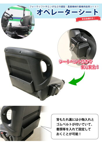 別途送料について(1個につき) ・法人あては送料無料です(※但し北海道・沖縄・離島地域は送料別途かかります) 【法人別途送料】(1個につき) 北海道1,500円、 沖縄2,500円※離島地域は別途送料を申し受けます 【個人配達別途送料】(1個につき) 沖縄・北海道以外1,500円、北海道3000円、沖縄4000円 ※別途送料につきましてはご注文後、改めてメールでご連絡いたしますので必ずご確認ください 仕様・状態 本体重量 15.8kg 生地 PVC サスペンションストローク 48mm サイズ 画像参照 梱包箱サイズ 580×580×750mm 商品説明 トヨタタイプの交換用オペレーターシート ! ●トヨタタイプのフォークリフトに取り付け可能 ●バックホー、運搬車、コンバイン、高所作業車、トラクターにもお使いいただけます ●安全第一!シートベルト、センサースイッチ付き※シートセンサーとは、シートに座らないとフォークリフトが動かないようになる機能です ●シートレールは16mm間隔で前後移動可能です(計176mm) ●乗員の疲労や負担を軽減できるサスペンション付き上級シート ●サスペンションは体重に合わせて減衰力を無段階に細かく調節可能 ●シートスライダー付きで、シート位置を前後に動かせます ●背もたれの裏に収納スペースがあり、書類等を積んでおくことができます 【取り付け方法】 ・シートレールを重機に装着して、シート本体を取り付けて下さい ・シートレールを使用せず、直接固定することも可能です ※本体を取り付ける際は、軍手をして作業をしていただくようお願いいたします ※機械側の取り付け穴等の加工を必要とする場合もあります ※サイズをよくご確認の上、ご注文下さい