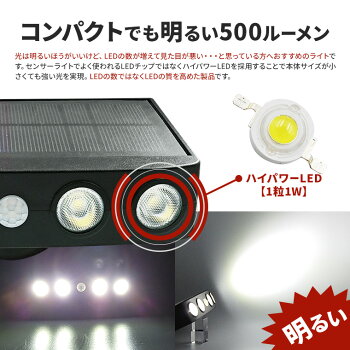 小さくて明るい!人感センサーライト センサーライトでよく使われるLEDチップではなくハイパワーLEDを採用することでコンパクトなデザインでも強い光(500ルーメン)を実現。