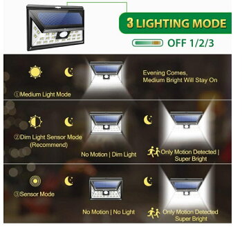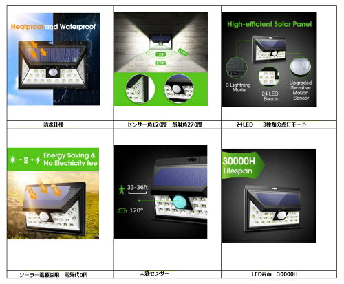 1,常時点灯モード 2,DIMセンサーモード (暗くなると薄暗く点灯し、人に反応し点灯します) 3,人感センサーモード (普段は消灯しており、人に反応し点灯します) 仕様 LED数量:24個 ソーラーパネル:1W / 5.5V センサー検出距離:6-8 m 高さ推奨1.5-2m 遅延時間:30秒 ワット数:3.5W リチウム電池:3.7V内蔵 センサー感知範囲:120度 防水保護レベル:IP44 光色:白 壁面取付ネジ付属 サイズ:151 * 55 * 105mm 重量 0.22KGS ※日本語説明書は付属しません ※輸入品の為、初期不良時のみの対応となります