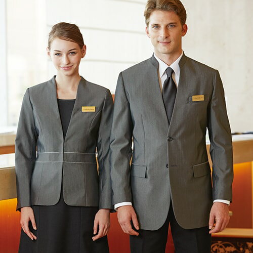 → ご利用ガイドへ最上級のおもてなしを演出するリッチな印象のシルバージャケットカラーレスのVゾーンにウエストのパイピング切り替えでニュアンスのある表情に。