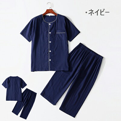 送料無料 メンズ パジャマ 綿100% 夏用 半袖 七分ズボン 前開き メンズルームウェア上下 パジャマ メンズ ダブルガーゼ 半袖 メンズルームウェア