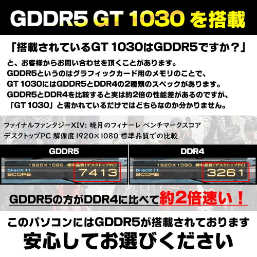 OS Windows 10 Pro 64bit ※Windows11への変更オプションも選択可能! CPU Intel 第3世代以降 Core i5 メモリ容量 8GB ストレージ容量 新品 SSD 256GB 内蔵グラフィックボード 新品 NVIDIA GeForce GT 1030 光学ドライブ DVDROMドライブ 付属オフィス KINFSOFT WPS Office ※同梱のライセンスカードにて認証を行ってください。