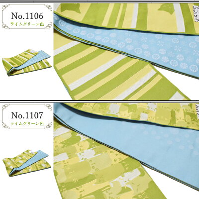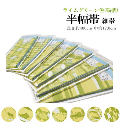 お洒落 半幅帯 猫柄【ライムグリーン色】(日本製品/猫 織柄/リバーシブル/小袋帯 細帯/カジュアル 変わり結び 浴衣 普段着 長尺 4.0メートル 着物 きもの 洗える着物 浴衣 袴下帯 浴衣帯 女性 )