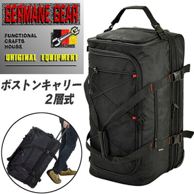 ◆素材 1680Dポリエスター 裏PVCコーティング ◆サイズ 横幅65×高さ36(43)×厚み35センチ [最大寸法69×38×35 最大高107cm] ◆重さ 約3,580g ◆容量 約100L ◆仕様 【本体正面】ネットポケット【本体(上層)内部】ファスナー付きネットポケット 【本体側面】ファスナーポケット(2ヶ所)、着脱式取っ手 ◆その他 2段階調節キャリーバー、2輪仕様ボストンキャリーバッグ ジャーメインギア 15177